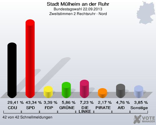 Stadt Mülheim an der Ruhr, Bundestagswahl 22.09.2013, Zweitstimmen 2 Rechtsruhr - Nord: CDU: 29,41 %. SPD: 43,34 %. FDP: 3,39 %. GRÜNE: 5,86 %. DIE LINKE: 7,23 %. PIRATEN: 2,17 %. AfD: 4,76 %. Sonstige: 3,85 %. 42 von 42 Schnellmeldungen http://www.votemanager.de