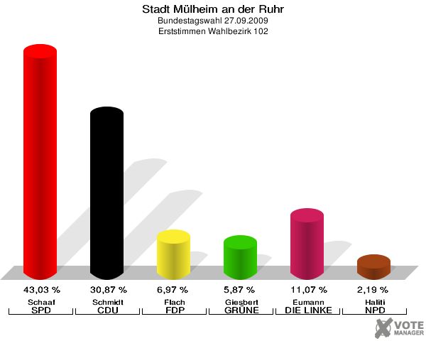 Stadt Mülheim an der Ruhr, Bundestagswahl 27.09.2009, Erststimmen Wahlbezirk 102: Schaaf SPD: 43,03 %. Schmidt CDU: 30,87 %. Flach FDP: 6,97 %. Giesbert GRÜNE: 5,87 %. Eumann DIE LINKE: 11,07 %. Haliti NPD: 2,19 %. http://www.votemanager.de