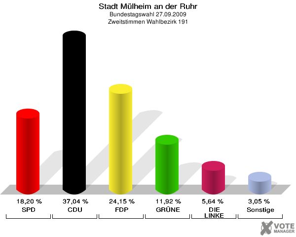 Stadt Mülheim an der Ruhr, Bundestagswahl 27.09.2009, Zweitstimmen Wahlbezirk 191: SPD: 18,20 %. CDU: 37,04 %. FDP: 24,15 %. GRÜNE: 11,92 %. DIE LINKE: 5,64 %. Sonstige: 3,05 %. http://www.votemanager.de