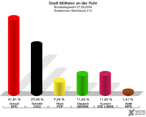 Stadt Mülheim an der Ruhr, Bundestagswahl 27.09.2009, Erststimmen Wahlbezirk 213: Schaaf SPD: 41,81 %. Schmidt CDU: 27,40 %. Flach FDP: 7,34 %. Giesbert GRÜNE: 11,02 %. Eumann DIE LINKE: 11,02 %. Haliti NPD: 1,41 %. http://www.votemanager.de