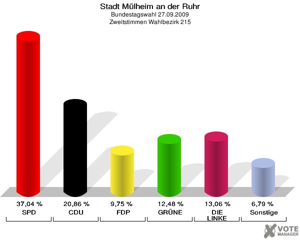 Stadt Mülheim an der Ruhr, Bundestagswahl 27.09.2009, Zweitstimmen Wahlbezirk 215: SPD: 37,04 %. CDU: 20,86 %. FDP: 9,75 %. GRÜNE: 12,48 %. DIE LINKE: 13,06 %. Sonstige: 6,79 %. http://www.votemanager.de