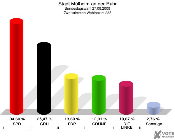 Stadt Mülheim an der Ruhr, Bundestagswahl 27.09.2009, Zweitstimmen Wahlbezirk 235: SPD: 34,60 %. CDU: 25,47 %. FDP: 13,60 %. GRÜNE: 12,91 %. DIE LINKE: 10,67 %. Sonstige: 2,76 %. http://www.votemanager.de